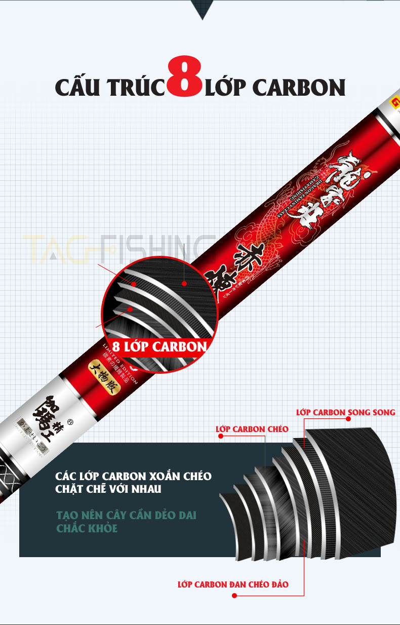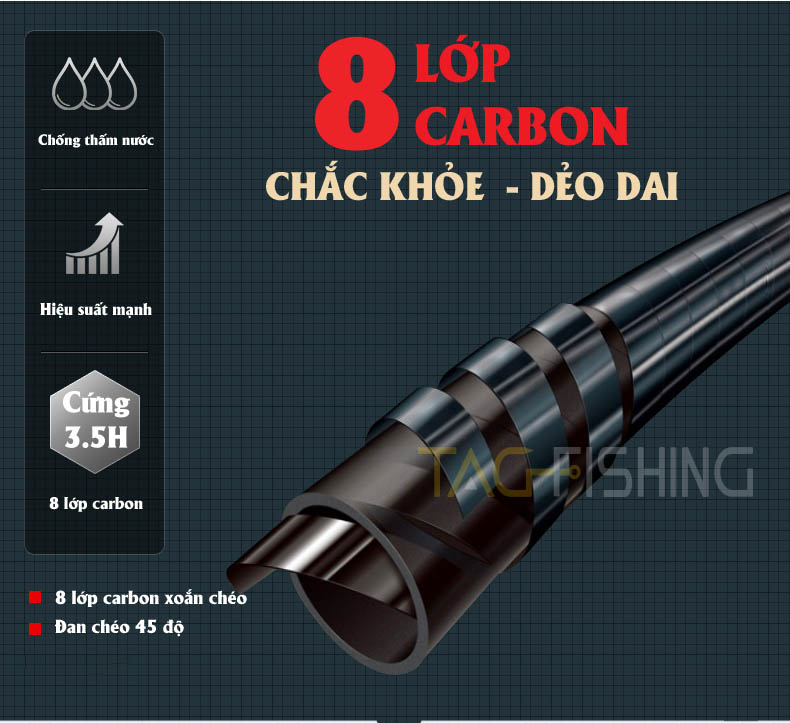 – Được làm từ vật liệu carbon Toray 46T cao cấp của Nhật Bản mang lại độ nảy tốt cho cây cần.
