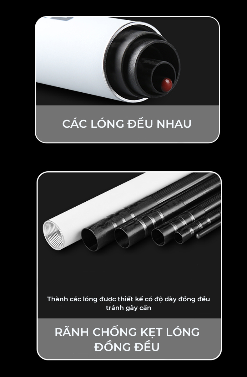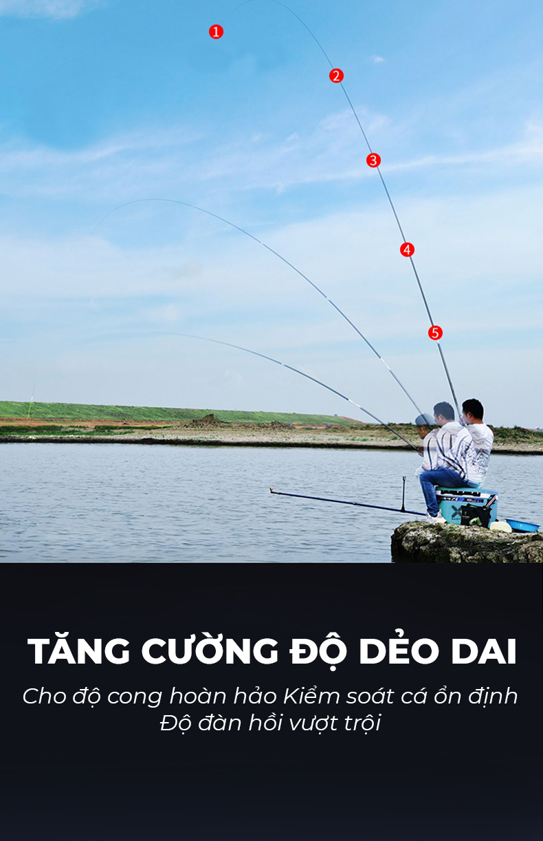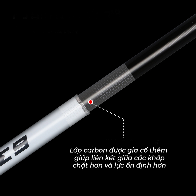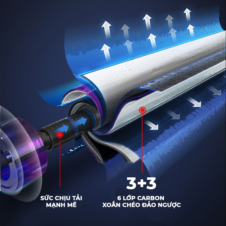 – Được làm từ vật liệu carbon cao cấp xoắn chéo 6 lớp giúp cần khỏe, độ nảy cao và trọng lượng nhẹ