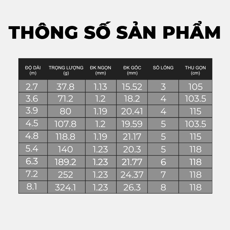 – Với trọng lượng nhẹ chỉ 71.2gr cho size cần 3m6