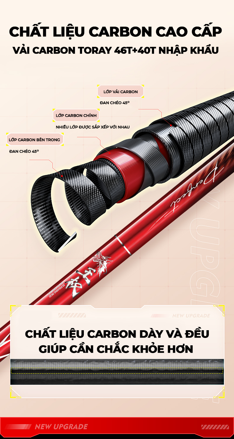 – Được làm từ vật liệu carbon cao cấp xoắn chéo 8 lớp giúp cần khỏe, độ chịu tải cao và trọng lượng nhẹ
