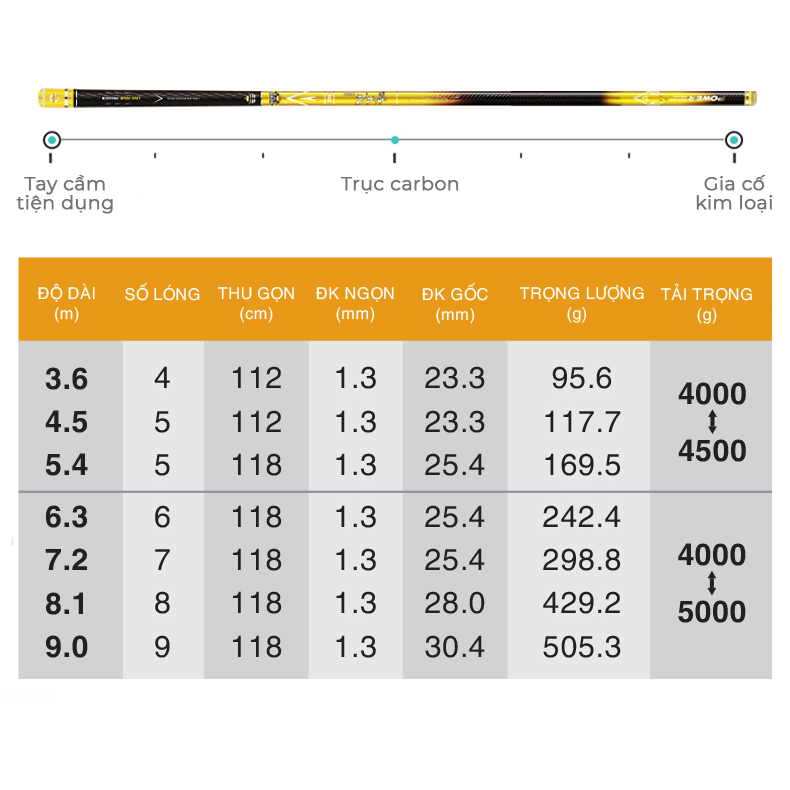 – Cần tay chuyên săn hàng với sức tải tĩnh lến tới 5000gr