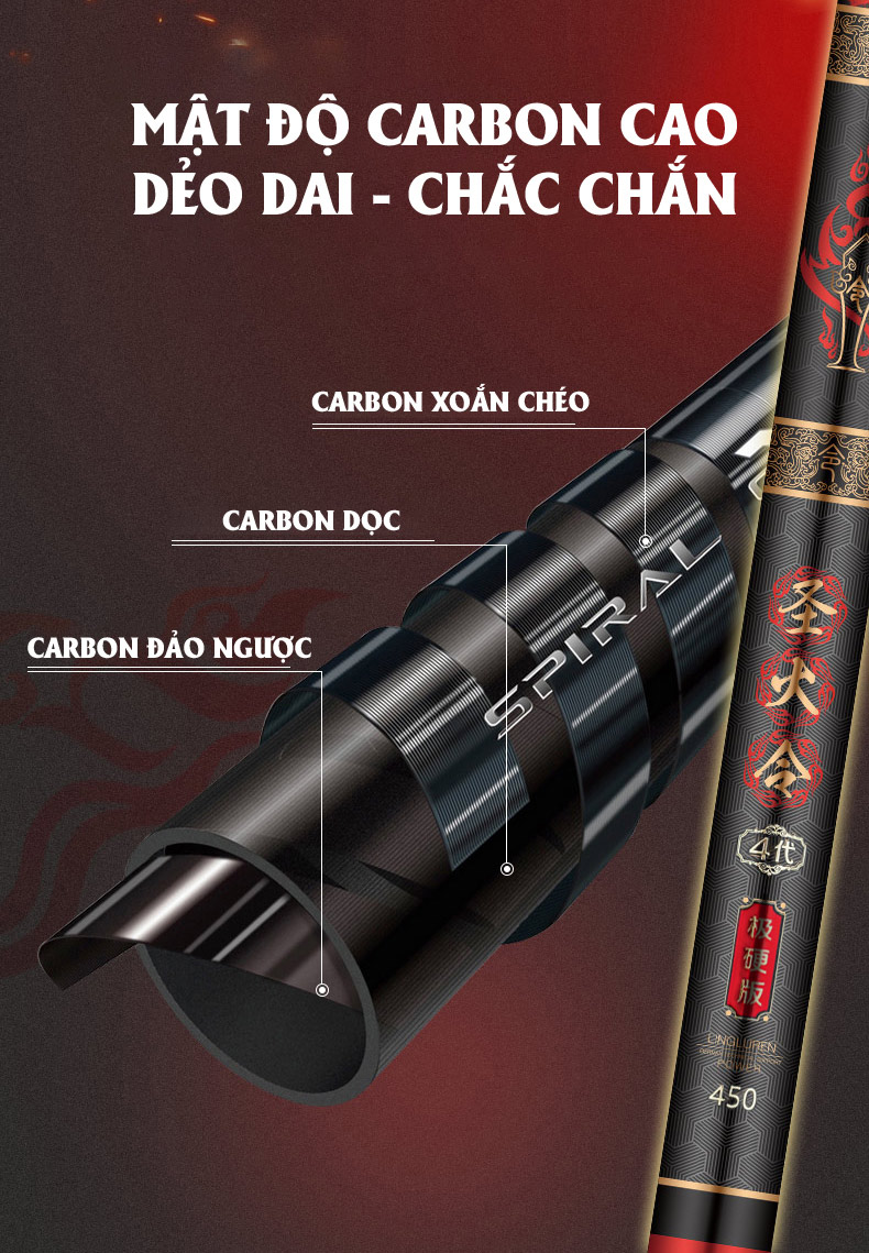 – Sử dụng công nghệ Đức, Được làm từ vật liệu carbon Toray 46T-60T cao cấp của Nhật Bản mang lại độ nảy tốt cho cây cần.