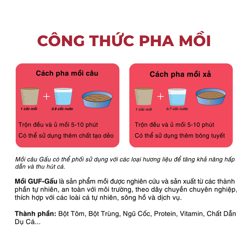 Đặc biệt: công thức dễ dàng, pha mồi cực kì đơn giản, dễ dùng phù hợp cho khách hàng câu tự nhiên, dịch vụ hay thi đấu.